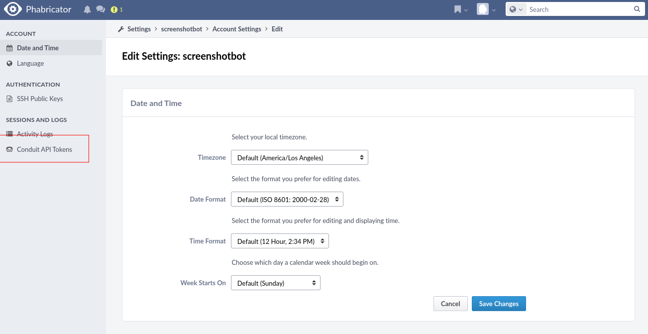 We recommend naming the bot screenshotbot, but the name does not matter. At this point you’ll need the Conduit API Key, which we’ll use later in Screenshotbot.