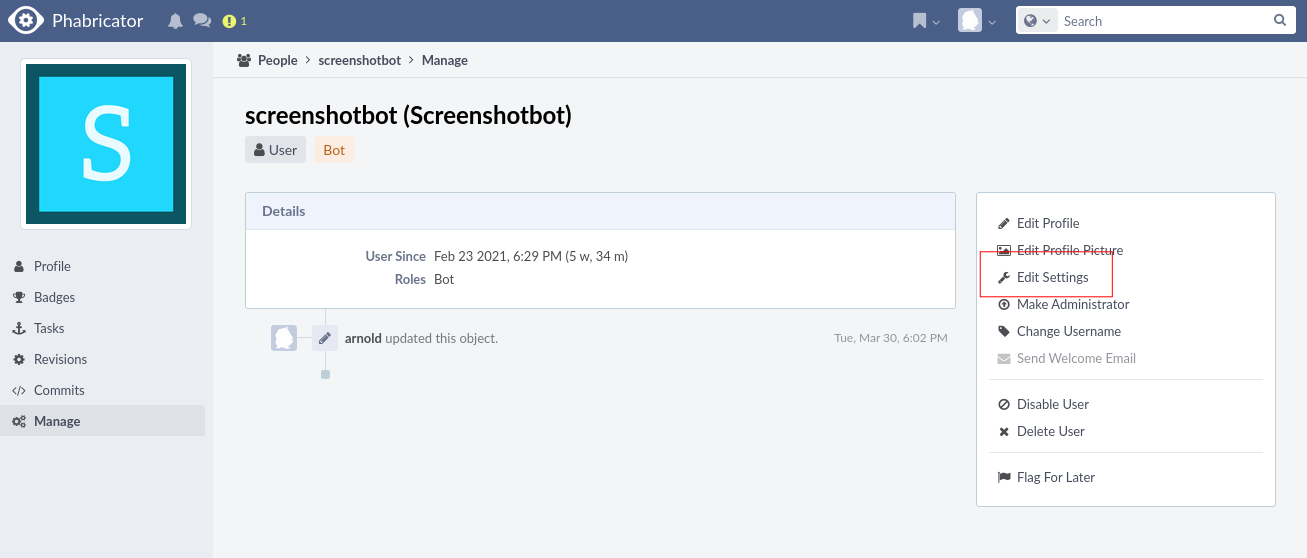 Screenshotbot will need a bot user to access Phabricator. As an Admin you can find this under People app: