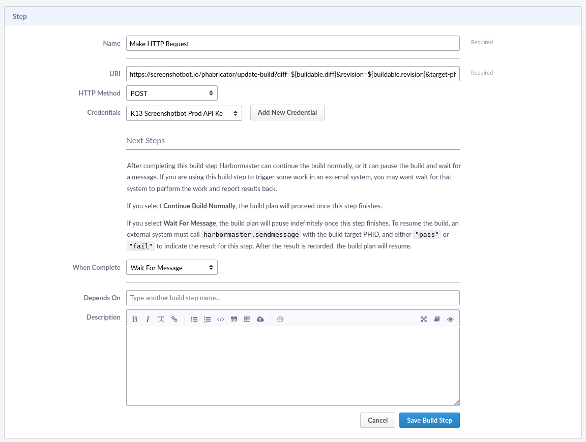 Finally, we need to provide the Diff ID when calling the Screenshotbot CLI. The exact parameters depend on your platform (Android/iOS/Selenium). Let’s work with a specific example. Let’s say you’re using the Phabricator for Jenkins plugin. This plugin will set up the DIFF_ID parameter on your jobs, and the job will be triggered by Harbormaster.