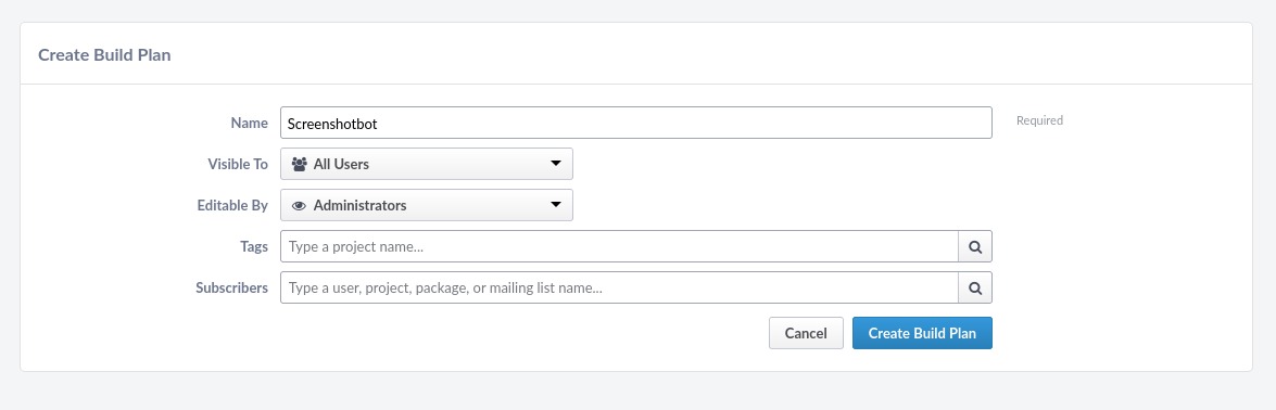 Open the Phabricator Harbormaster app (e.g. https://phabricator.example.com/harbormaster). Click the Manage Build Plans on your left, and then click the Create Build Plan on your top right. We'll now create a simple build, let's call it Screenshotbot.